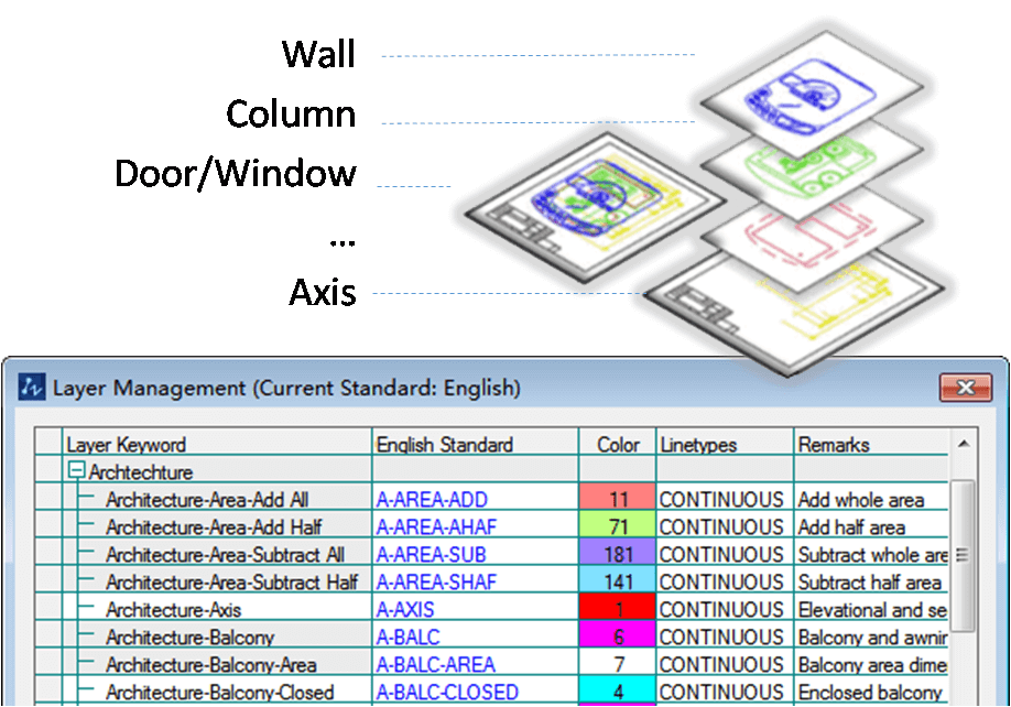 El sistema inteligente de gestión de capas coloca automáticamente los elementos en la capa correcta, aplica color y tipo de línea a medida que crea su dibujo.