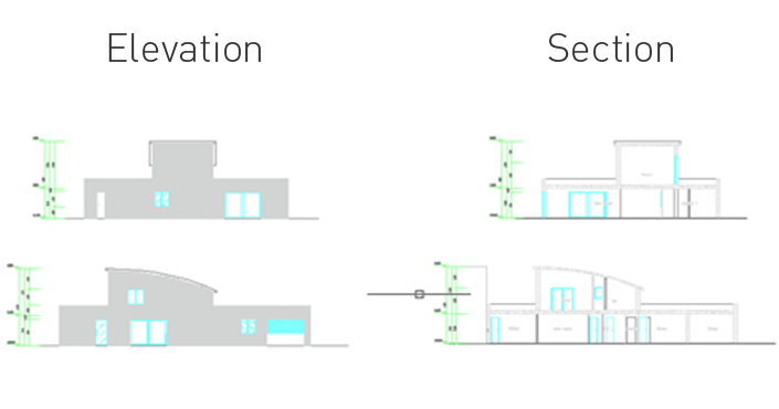 A partir del plan 2D terminado, la elevación y la sección se pueden generar con unos pocos clics. Componga pisos, paredes, puertas, escaleras y techos del plano 2D.